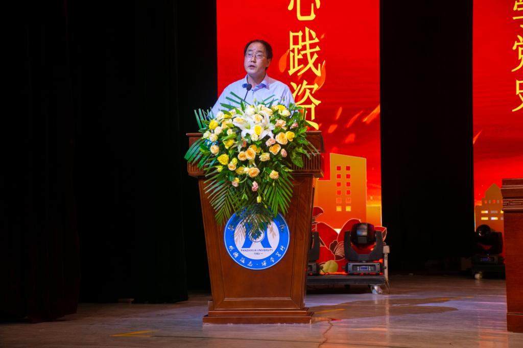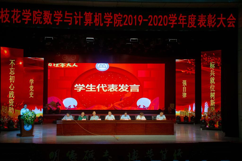 6月19日晚,数计学院(大数据学院)在学校本部会堂举行2019-2020学年度表彰大会暨千锋互联奖助学金捐赠仪式,大会“学党史,不忘初心践资助强自律,标兵就位树新风主题。学生工作部负责人、千锋互联科技有限公司西南大区经理王雪青、北京华晟经世信息技术股份有限公司攀枝花学院项目经理张杰、数学与计算机学院党政负责人以及相关负责人、全体教师150余名受表彰学生以及各年级学生代表参大会学院党相关负责人主持会议