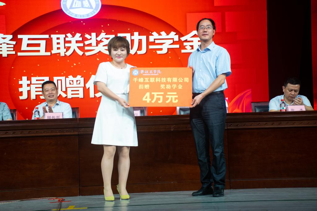 王雪青代表千锋互联科技有限公司向数计学院捐助奖助学4万元并代表公司表达了校企合作的积极意愿希望同学们能够勤奋努力,不忘初心,牢记使命。同时也承诺公司将会围绕数计学院人才培养给予更大的支持,为学生探索更多更好的学习实践机会。