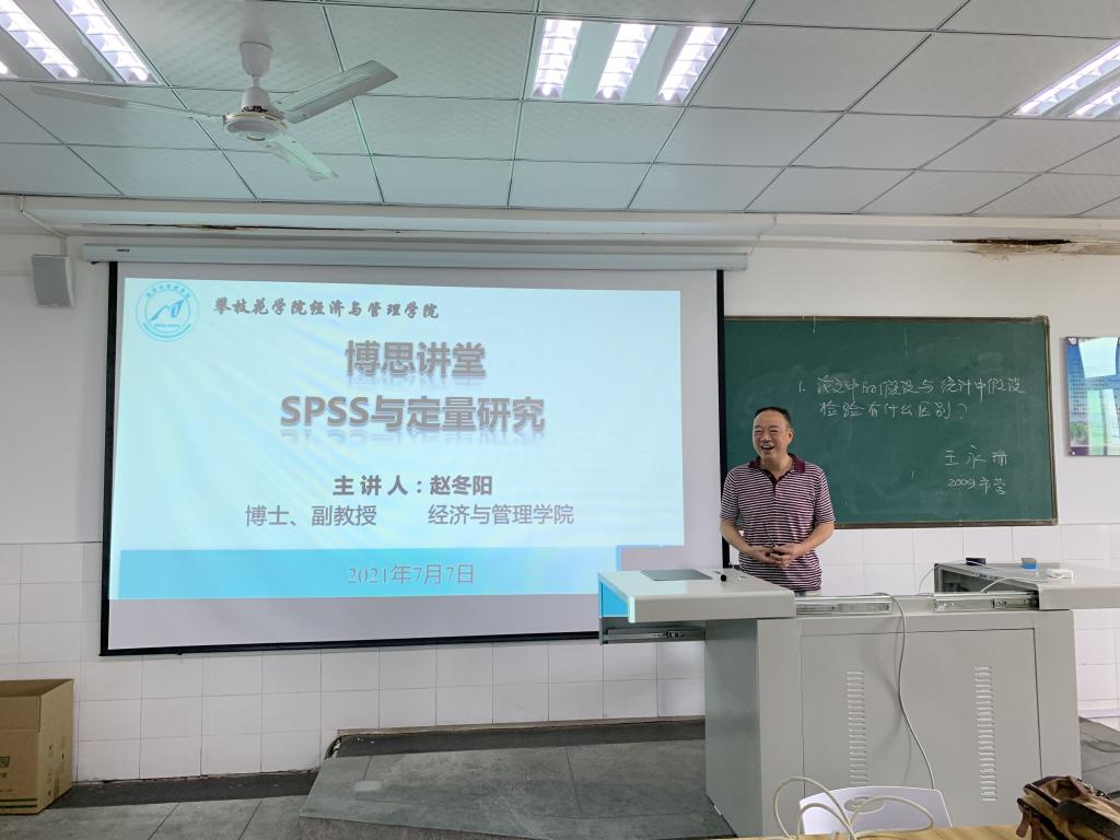 7月7日上午,赵冬阳副教授进行了题为《SPSS与定量研究》的讲座。从实证研究数据分析工具、SPSS介绍与基本操作和问卷分析流程演示性操作三个方面进行分享,赵冬阳副教授将理论与实际结合起来,为老师们深入浅出的讲解了SPSS软件的具体操作方式,对老师们提高SPSS软件应用能力,掌握定量研究方法具有重要的意义。