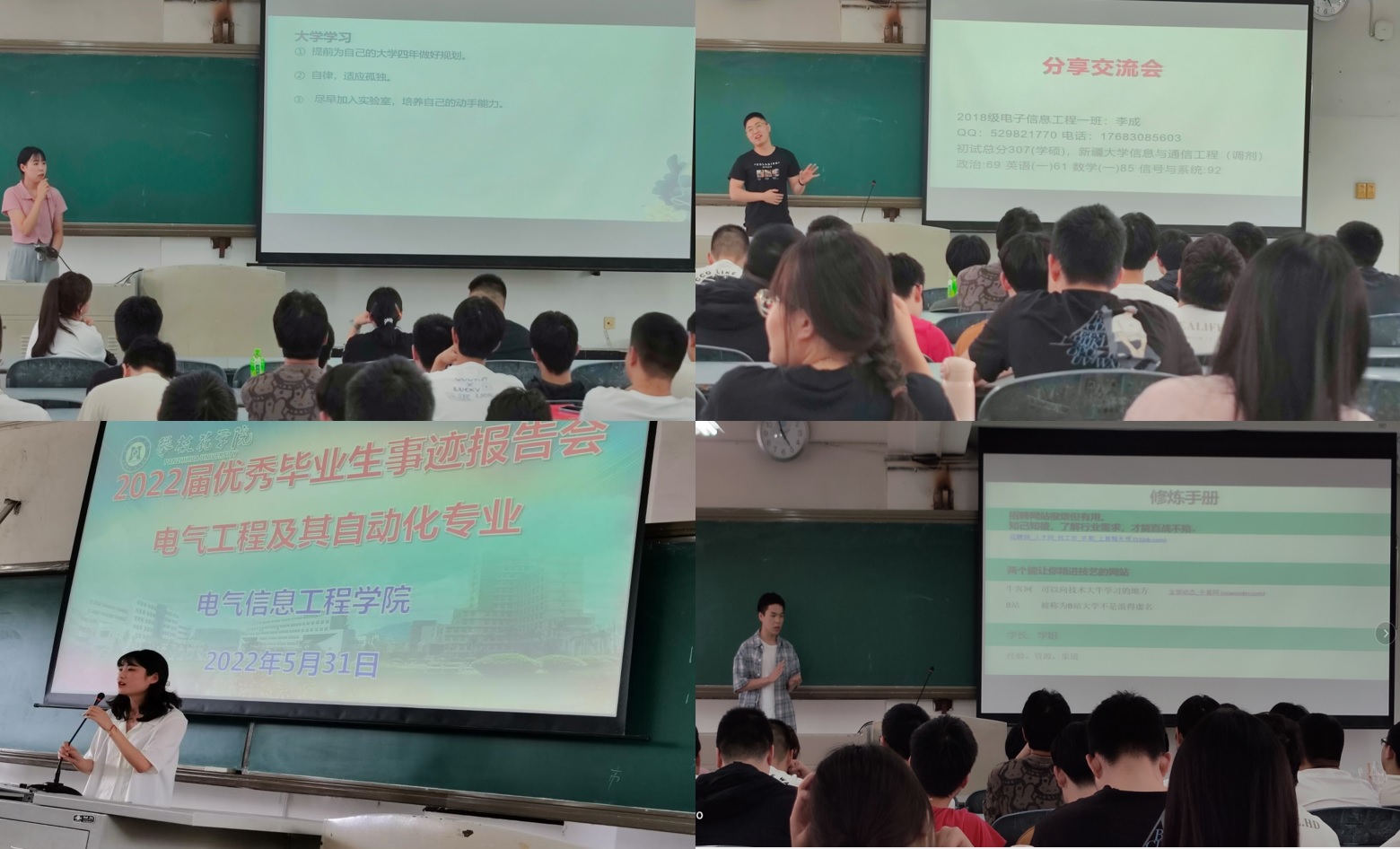 为发挥榜样力量,帮助学生们进一步做好学业规划和职业生涯发展规划,近期,电气信息工程学院开展了2022届优秀毕业生先进事迹分享交流会。学院的四名优秀毕业生代表分享了各自的考研、考公、就业面试的经验和感悟
