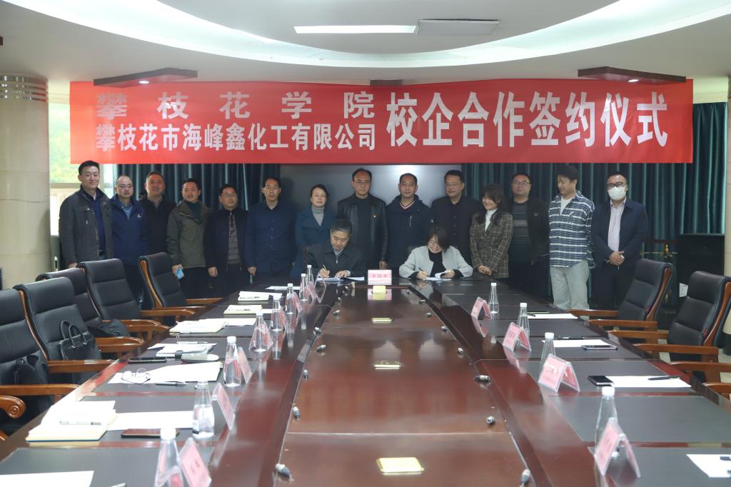 12月14日下午,我校与攀枝花市海峰鑫化工有限公司举行校企合作洽谈,并举行签约仪式。副校长王兵,攀枝花市海峰鑫化工有限公司人力行政中心总监张锦秀出席仪式。公司董事会秘书、研发技术中心、人力行政中心相关负责人,学校产教融合发展部、学工部、创新创业学院、电气学院、生化学院、智造学院、钒钛学院相关负责人和教师代表参加会议。