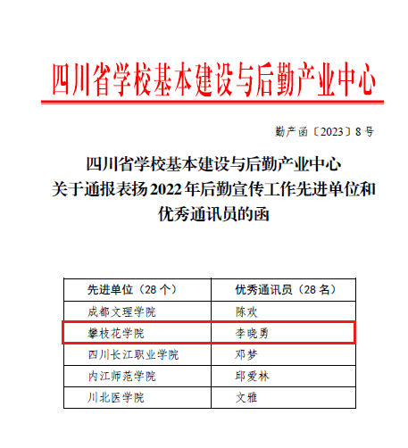 近日,四川省学校基本建设与后勤产业中心通报表扬了2022年后勤宣传工作先进单位和优秀通讯员,我校被授予“先进单位”荣誉称号,后勤处李晓勇同志荣获“优秀通讯员”称号