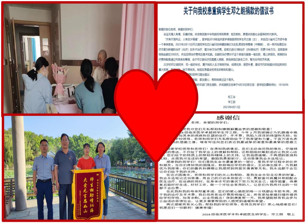 20232月,2018级临床医学卓越班学生邓之朗不幸确诊为乳腺癌中晚期,医院估计需治疗费30余万邓之朗同学来自四川省内江市资中县一个单亲家庭,一直和母亲生活,家庭收入主要靠外出务工。一场大病让这个本就经济条件窘迫的家庭雪上加霜