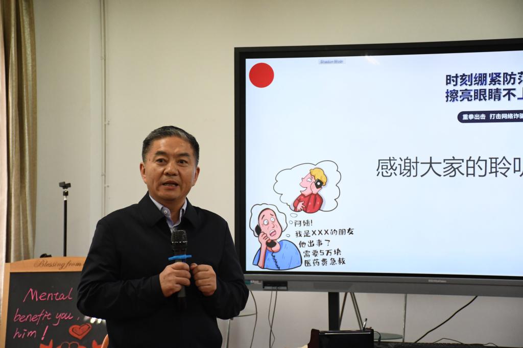 谷大平开展了题为“拒绝网络陷阱,提升法律意识”的讲座,围绕电信网络诈骗与校园安全的主题从电信网络诈骗作案过程及作案手法、电信网络诈骗犯罪新趋势、电信网络诈骗易感人群画像、学校预防及应对方法等四个方面进行系统阐述,以案释诈、依法论事,深入浅出地为广大辅导员送上一场反诈知识“盛宴”。在提问环节,辅导员们就工作中遇到的防诈困惑与谷大平进行沟通交流。
