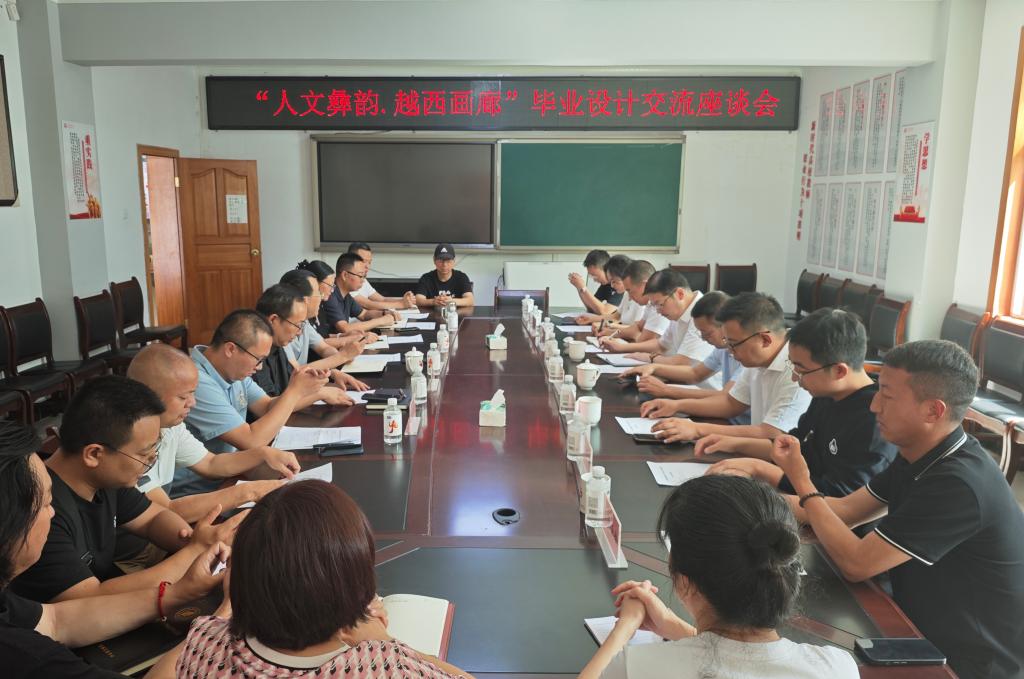 在参观过程中,张旭辉、蹇丹对展出作品给予了高度评价。随后,在学院会议室就项目后续合作安排进行了深入交流。蹇丹表示,本次展出的作品在一定程度上展现出了越西县的地域特色和文化底蕴,他期待未来双方能够进一步加强合作交流,并诚挚邀请毕业设计作品到越西县再举办展览。张旭辉对艺术学院在产教融合、服务地方等方面取得的成绩予以充分肯定,并强调要继续深入挖掘越西经济文化特色,充分发挥我校多学科优势,全面开展合作和设计创新。同时,他要求学院以本科评估为契机,提升教学质量,为服务地方经济发展作出更大贡献。