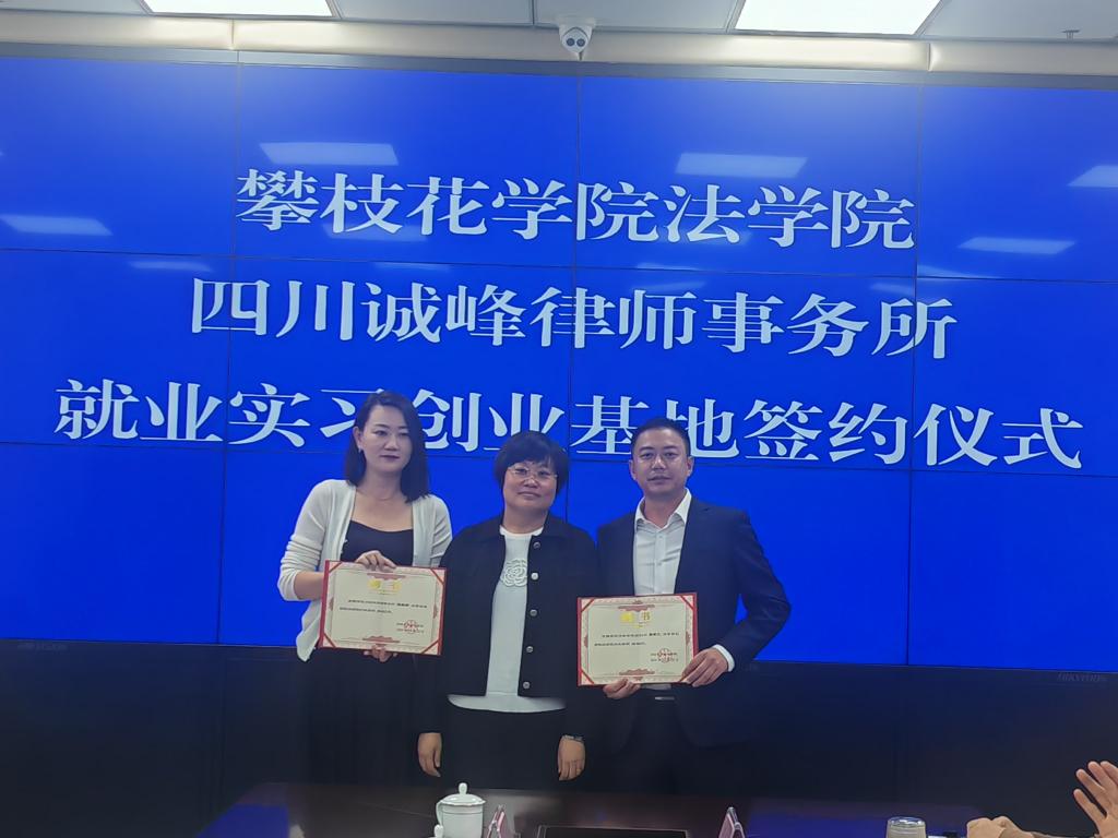 与会人员围绕法律服务实践、产教融合、高质量就业等方面进行了深入交流探讨,双方达成了初步合作意向。随后,张琳为四川诚峰律师事务所授牌“攀枝花学院法学院就业实习创业基地”,为蒋风云等律师颁发行业导师聘书,并与蒋风云共同签署了《法学本科生就业实习创业基地共建协议书》。