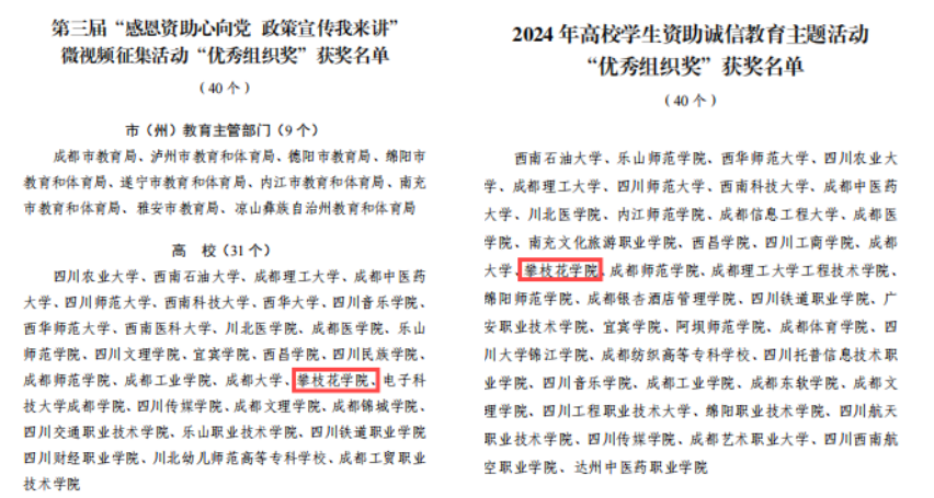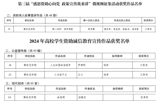 近日,四川省教育厅公布了2024年全省资助育人系列活动的获奖情况,在全省高校学生资助诚信教育主题活动暨宣传作品征集活动中,我校获公益宣传画三等奖两项,现代短诗优秀奖一项。在第三届“感恩资助心向党 政策宣传我来讲”微视频征集活动中。我校辅导员莫伟豪团队作品《暖心向阳 筑梦领航》获资助育人故事宣讲作品三等奖。我校在两项赛事均获“优秀组织奖”。
