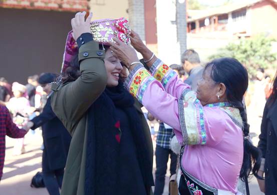 彝族民间艺人为国际留学生戴上彝族特色服饰