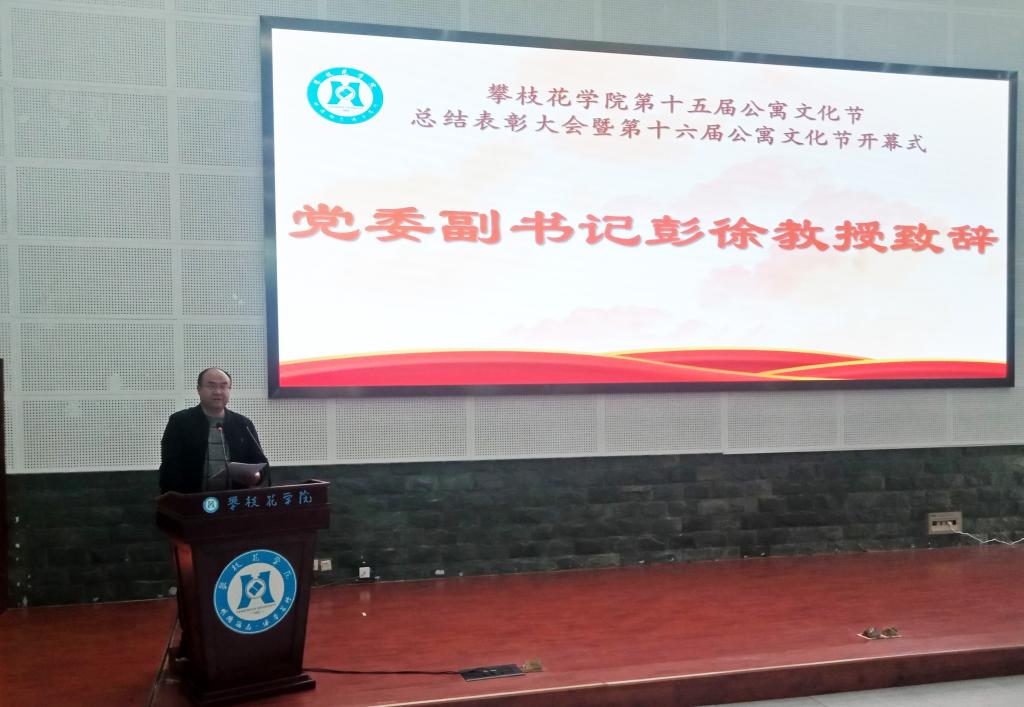 10月30日上午,我校第十五届公寓文化节总结表彰大会暨第十六届公寓文化节开幕式在学术报告厅举行。省纪委监委驻攀枝花学院纪检监察组组长、校党委副书记、纪委书记彭徐出席开幕式,宣传统战部、学生工作部、校团委、保卫处、后勤管理处负责人,各二级学院分管学生工作领导、学生科长以及百余名学生代表到场参加。